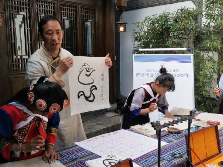 “我接触学习东巴象形文字绘画已有30多年。2016年9月,在丽江古城纳西象形文字绘画体验馆担任馆长,一直致力于现场教授书写纳西象形文字、画东巴画,讲解传统纳西象形文字、绘画的含义及意义。”在接受本报记者采访时,纳西族东巴画传承人和闰元这样介绍自己。 6月2日至3日,丽江古城大研街道举办为期两天的2022年“和美大研·浓情端午”文化系列活动,有文化、手工艺、美食等领域的非遗传承人参与,和闰元是其中的一员。在“学写东巴字”体验区,和闰元全程参与,为孩子们讲解东巴文字、绘画、历史和传统风俗,教孩子们书写东巴文字。 和闰元从小喜爱绘画,13岁时师从丽江民间画家,曾得到多位东巴画师的指导,对东巴象形文字产生了浓厚的兴趣,开始在老东巴的指导下学习东巴文字,在创作东巴画的过程中,并用现代技法将东巴象形文字艺术化。在北京、昆明等地举办过多次个人画展。 |